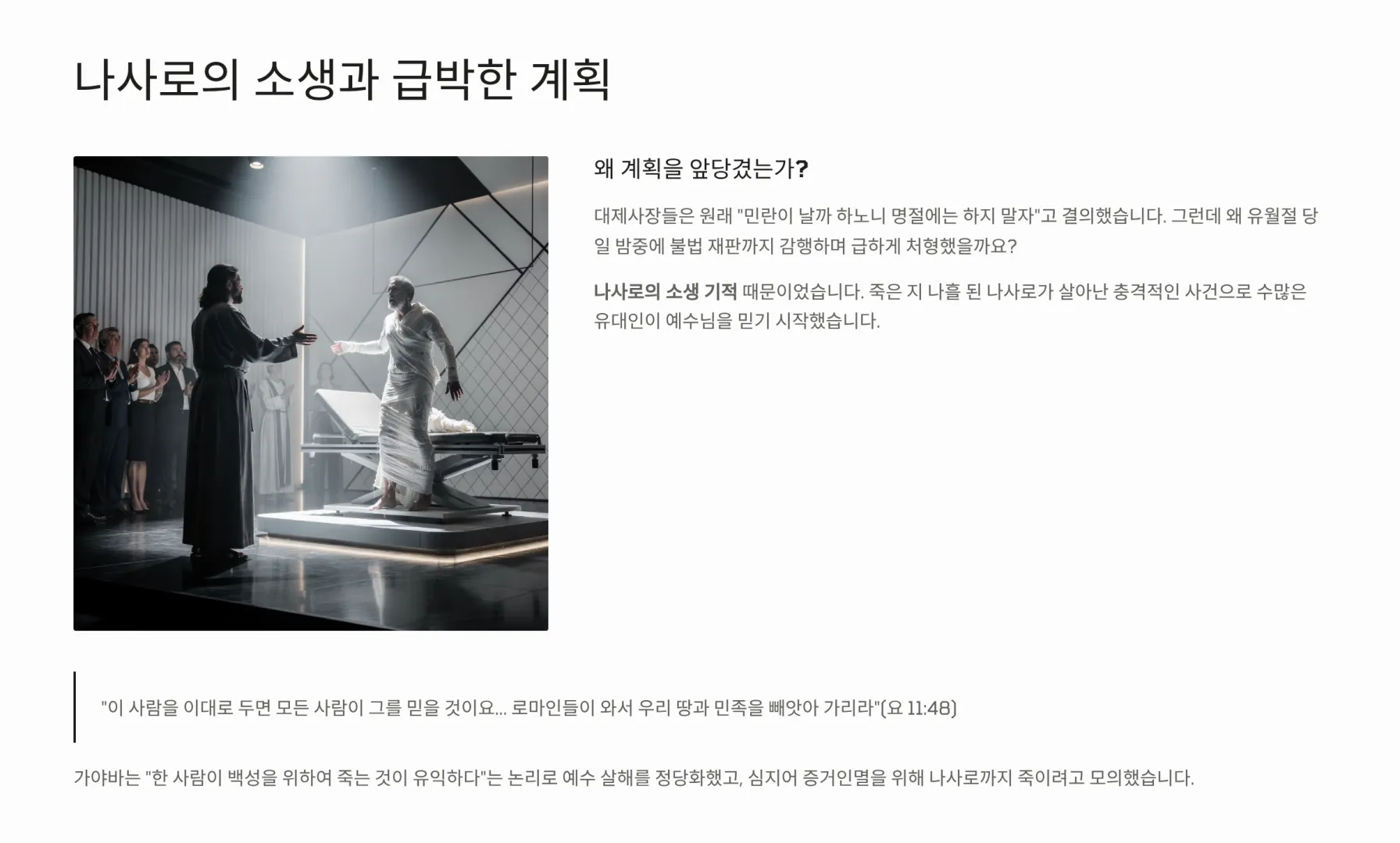 그런데 왜 그들은 자신들의 결의를 뒤집고 유월절 당일에, 그것도 밤중에 불법 재판까지 감행하며 그 다음날 아침에 급하게 예수님을 처형했을까? 마태복음은 가룟 유다의 배신을 그 계기로 설명하지만, 요한복음은 더 근본적이고 정치적인 배경을 제시한다. 그것은 바로 '나사로의 소생 기적' 때문이었다(요11:1~44).