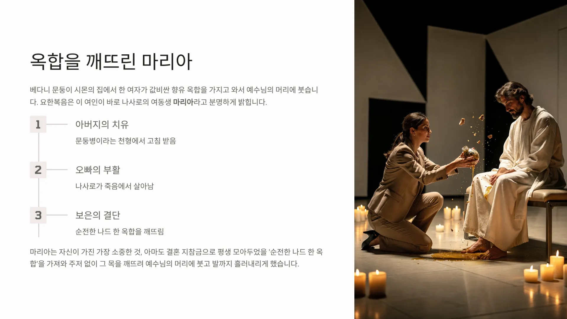5. 향유 부은 여인은 누구이며, 왜 값비싼 옥합을 깨뜨렸는가?