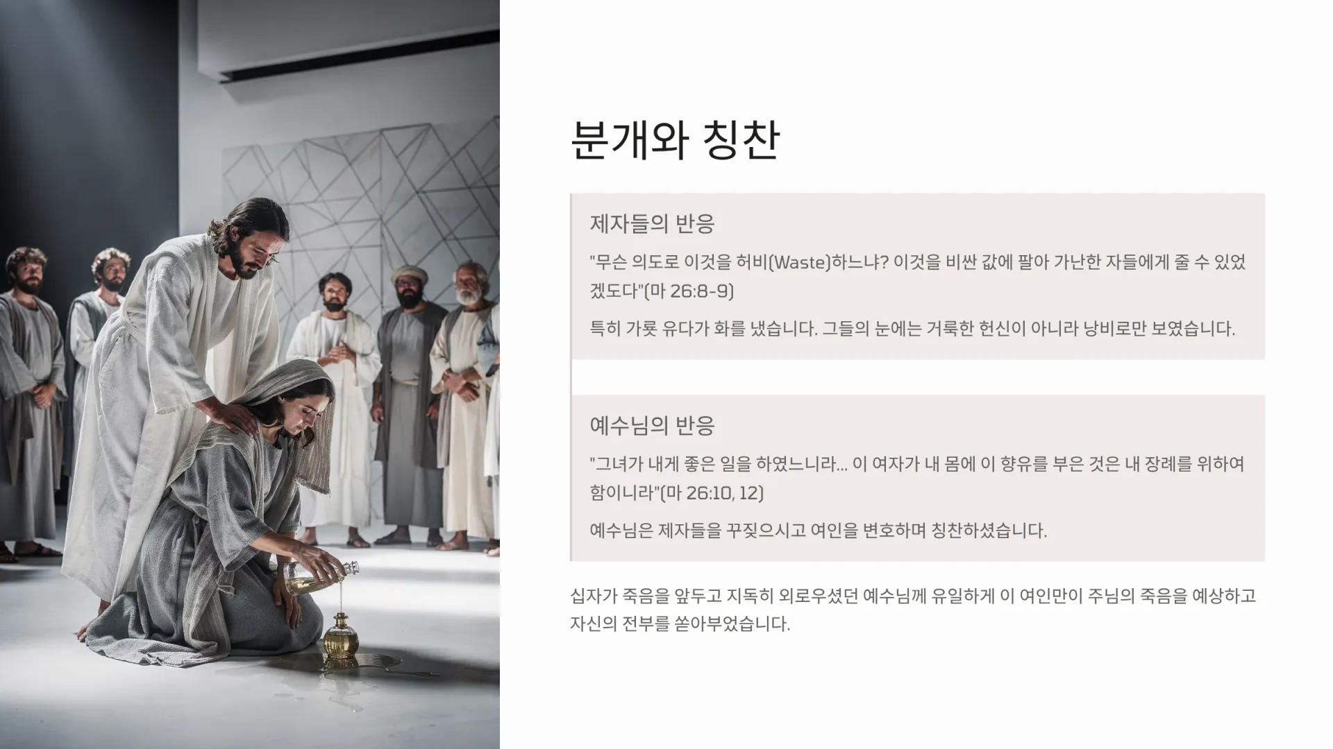 그런데 이렇나 마리아의 헌신을 본 제자들의 반응은 완전히 달랐다. 싸늘했다. 특히 가룟 유다는 "무슨 의도로 이것을 허비(Waste)하느냐?"면서 "이것을 비싼 값에 팔아 가난한 자들에게 줄 수 있었겠도다"(마 26:8-9)며 화를 냈다. 인간적인 계산기를 두드려본다면 그들의 말이 틀린 것은 아니다. 300 데나리온이면 노동자의 일년치 품삯이므로 수많은 빈민을 구제할 수 있는 돈이었기 때문이다. 그러자 그들의 눈에는 그것이 거룩한 헌신이 아니라, 그저 낭비로만 보였던 것이다.