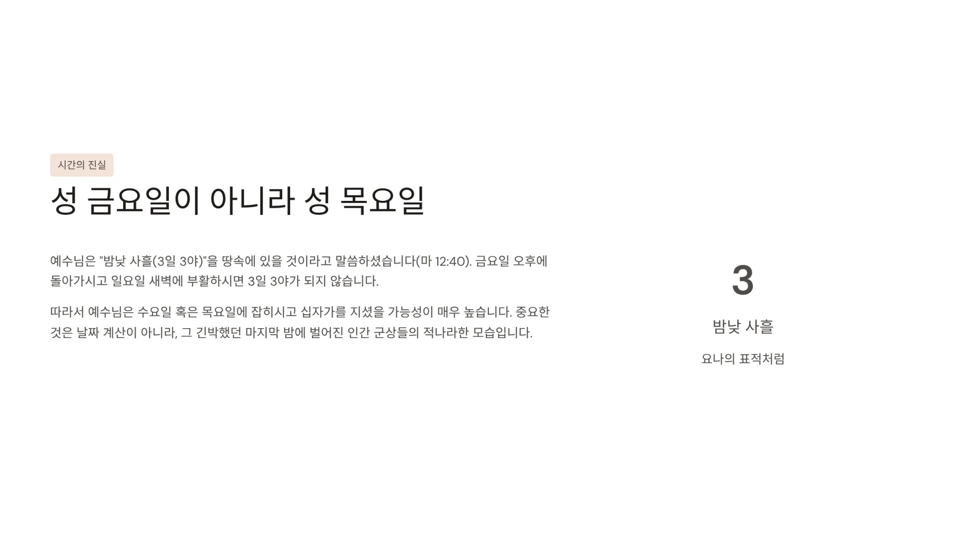 성도들은 새로운 해가 되면 고난주간을 보내며 예수님의 십자가 행적을 묵상한다. 흔히 예수님께서 십자가에 달리신 날을 '성 금요일(Good Friday)'이라고 부르고, 그 전날 밤에 최후의 만찬을 하신 것이라고 생각한다. 그러나 성경을 정밀하게 연구해 보면, 기존의 상식과는 조금 다른 시간표가 드러난다.