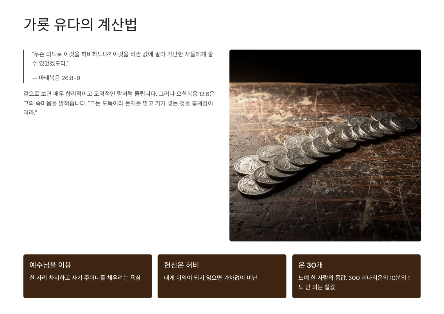 결국 그는 자신의 기대가 무너지자 예수님을 팔아넘기기로 결단한다. 가격은 고작 '은 30개'. 이는 노예 한 사람의 몸값이자, 300 데나리온의 10분의 1도 안 되는 헐값이다. 마리아는 300 데나리온을 드려도 아깝지 않게 생각했지만, 유다는 은 30개에 스승을 팔아버린다. 사랑하면 전부를 드려도 부족하다 여기지만, 이용하려 하면 가치가 떨어지는 순간 헌신짝처럼 내버리는 것이다. 과연 나는 예수님을 사랑하고 있는 사람인가, 아니면 예수님을 이용하고 있는 사람인가?