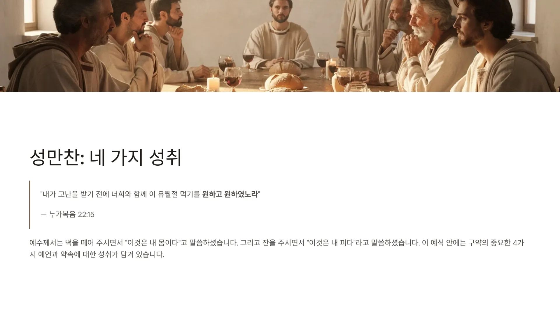 그때 예수께서는 떡을 떼어 주시면서 "이것은 내 몸이다"고 말씀하셨다. 그리고 잔을 주시면서 "이것은 내 피다"라고 말씀하셨다. 이것이 오늘날 우리가 행하는 '성만찬(Lord's Supper)'의 시작이다. 예수께서는 단순한 기념 음식을 먹게 하신 것이 아니다. 그럼, 무엇인가? 이 예식 안에는 구약의 중요한 4가지 예언과 약속에 대한 성취를 담고 있기 때문이다.