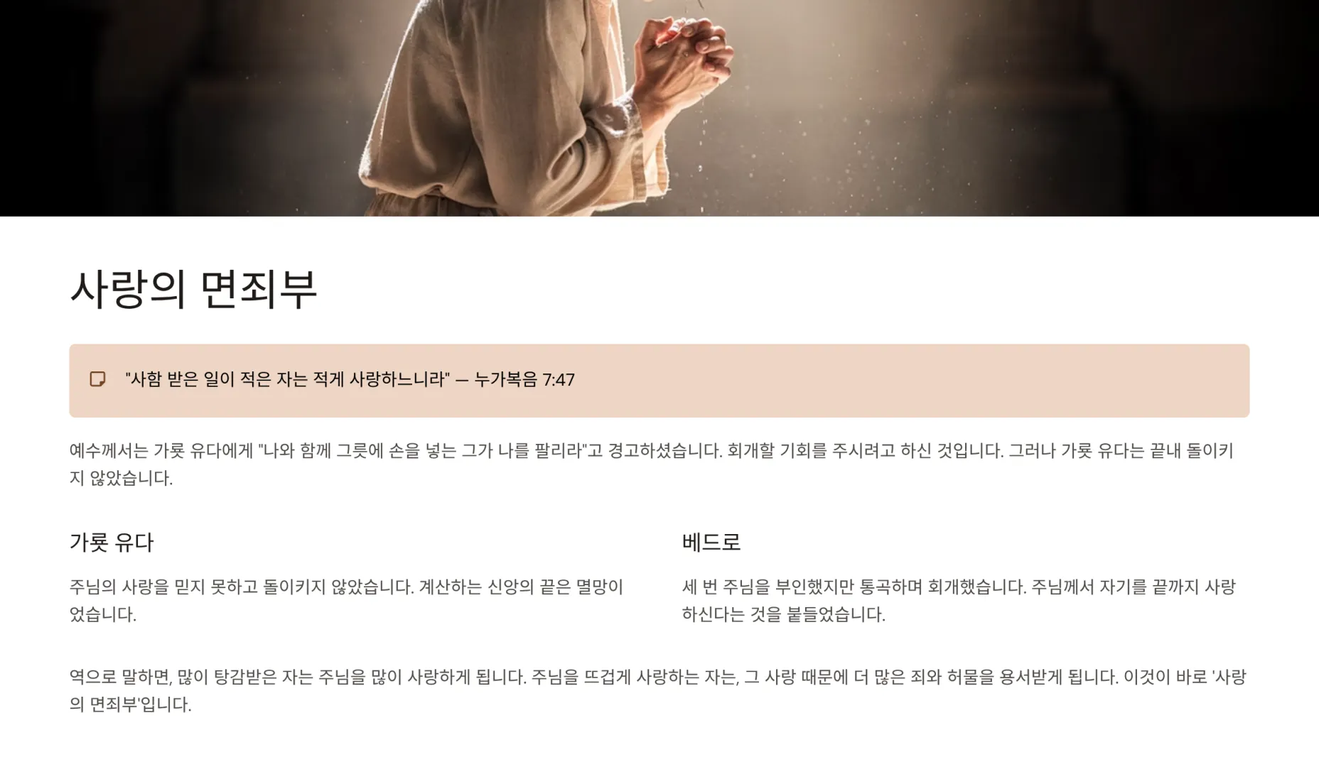 누가복음 7장을 보라. 예수께서는 500 데나리온 빚진 자와 50 데나리온 빚진 자의 비유를 말씀하시면며 "사함 받은 일이 적은 자는 적게 사랑하느니라"(눅 7:47)고 하셨다. 역으로 말하면, 많이 탕감받은 자는 주님을 많이 사랑하게 된다는 뜻이다. 결국 주님을 뜨겁게 사랑하는 자는, 그 사랑 때문에 더 많은 죄와 허물을 용서받게 되는 것이다. 이것이 바로 '사랑의 면죄부'인 것이다.