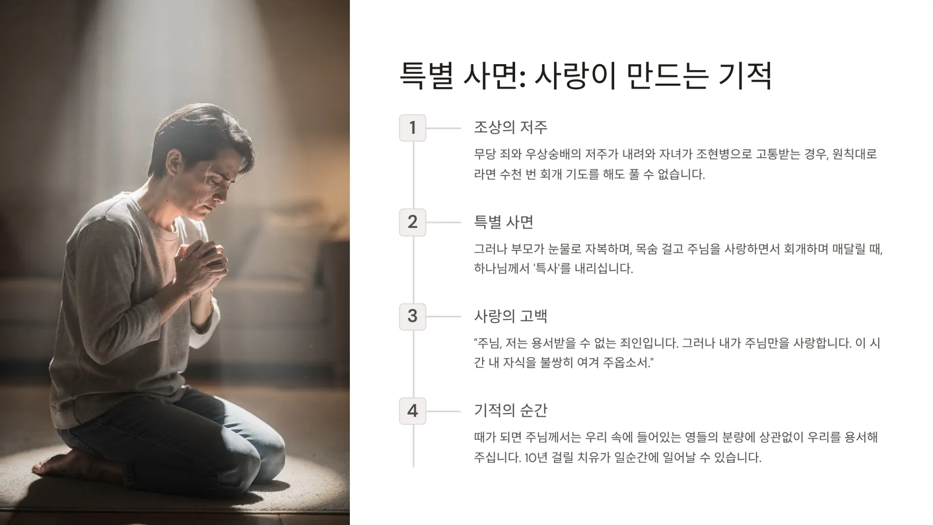 필자가 아는 어떤 성도님은 자녀가 조현병으로 고통받고 있었다. 조상의 무당 죄와 우상숭배의 저주가 내려온 것이다. 원칙대로라면 수천 번 회개 기도를 해도 그 저주가 풀 수 없다. 그런데 어떤 분은 불과 몇 달 만에 자녀가 낫기도 했다. 어떻게 그럴 수 있는가? 대통령이 광복절에 '특별 사면'을 내리듯이, 하나님도 '특사(Special Amnesty)'(특별 사면 조치)를 내리실 때가 있다. 언제인가? 부모가 눈물로 자복하며, 목숨 걸고 주님을 사랑하면서 회개하면서 주님께 매달릴 때다. "주님, 저는 용서받을 수 없는 죄인입니다. 그러나 내가 주님만을 사랑합니다. 이 시간 내 자식을 불쌍히 여겨 주옵소서."라고 기도할 때에 주님께서는 때가 되면 우리 속에 들어있는 영들의 분량에 상관없이 우리를 용서해주신다.