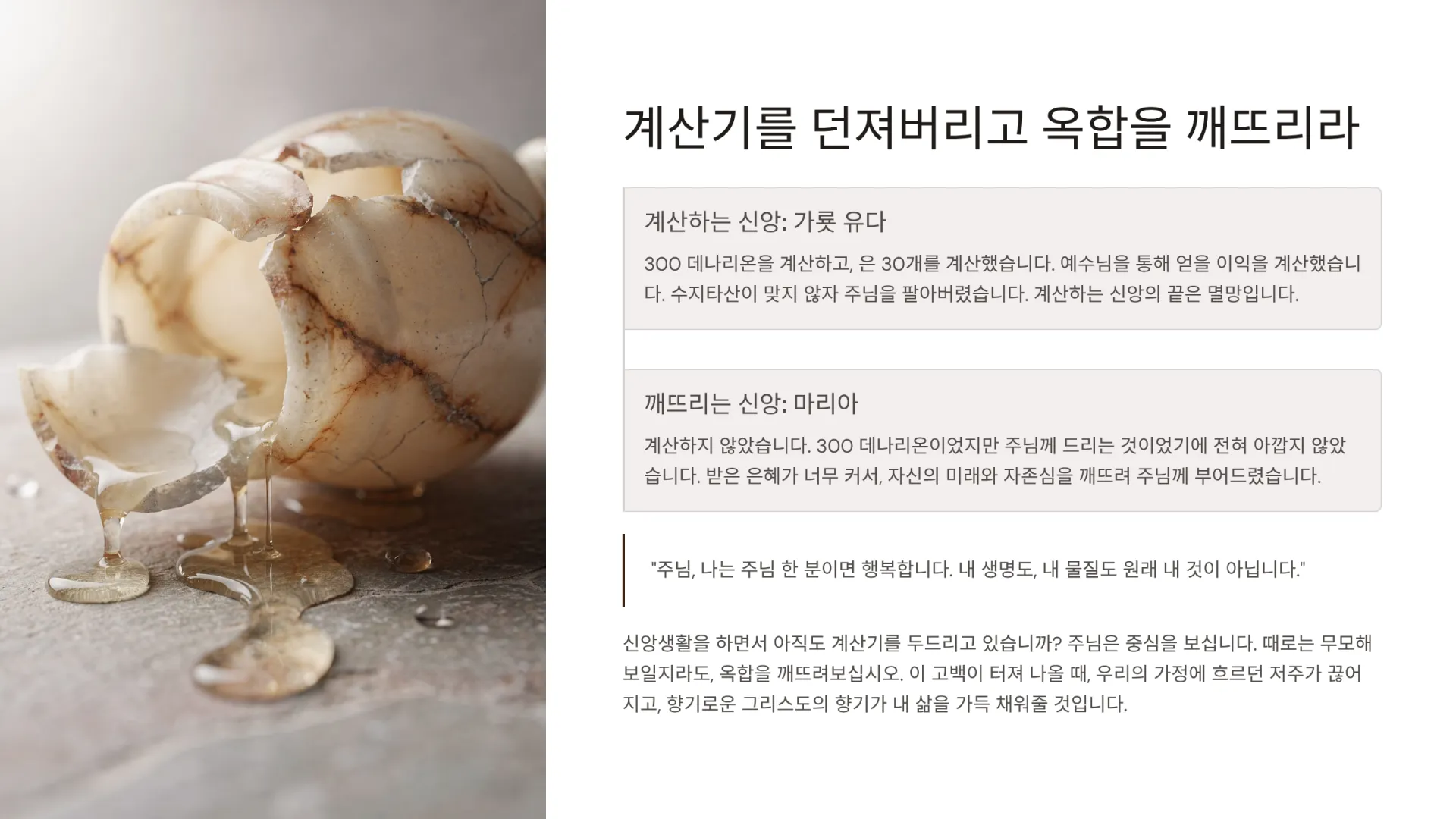 9. 나오며: 계산하는 신앙이 아니라 옥합을 깨뜨리는 사랑으로