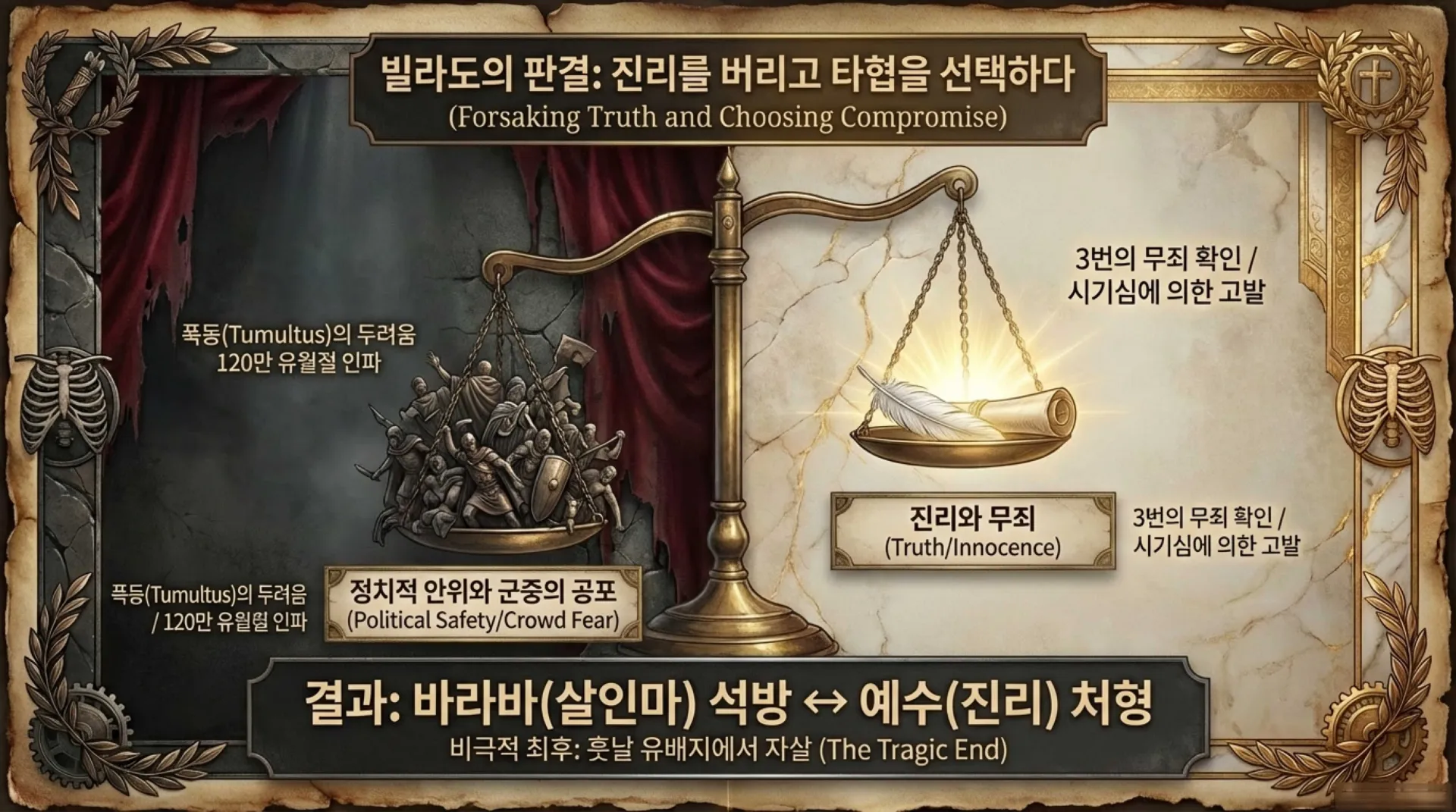 그러나 빌라도는 진리 편에 서지 못했다. 명절을 맞아 예루살렘에 운집한 120만 명에 달하는 유대 군중들이 폭동(밀란)을 일으킬까 두려웠기 때문이다. 만약 폭동이 일어나면 자신의 통치력에 치명적인 오점이 남아 로마 황제에게 문책을 당할 것이 뻔했다. 결국 그는 자신의 정치적 안위와 인기를 지키기 위해, 특사 제도를 악용하여 살인마 바라바를 놓아주고 죄 없는 예수님을 십자가에 내어주는 비열한 타협을 선택했다. 그리고는 무리 앞에서 손을 씻으며 "이 사람의 피에 대하여 나는 무죄하다" (마 27:24)라며 가증스러운 책임 회피를 시도했다.