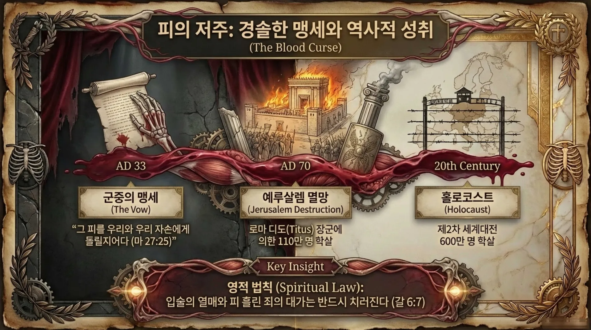 입술의 열매, 특히 피 흘린 죄의 대가는 반드시 누군가가 치러야 하는 영적 인과응보(갈 6:7)의 법칙이 있다. 군중들이 경솔하게 내뱉은 이 무서운 선언은 곧바로 이스라엘의 피비린내 나는 역사로 성취되었다. 예수님이 십자가에 돌아가신 지 40년 후인 AD 70년, 로마의 디도(Titus) 장군은 예루살렘을 포위하고 무려 110만 명의 유대인을 무참히 학살했으며, 살아남은 10만 명을 로마 콜로세움 건설의 노예로 끌고 갔다. 나아가 제2차 세계대전 당시 히틀러의 홀로코스트를 통해 600만 명의 유대인이 독가스실에서 처참하게 학살당하는 민족적 비극을 겪어야만 했다. 지도자들의 악한 선동에 분별없이 동조하고 진리를 저버린 군중의 죄악이, 그들의 후손들에게 얼마나 참혹한 피의 대물림을 가져왔는지 잊지 말아야 한다.