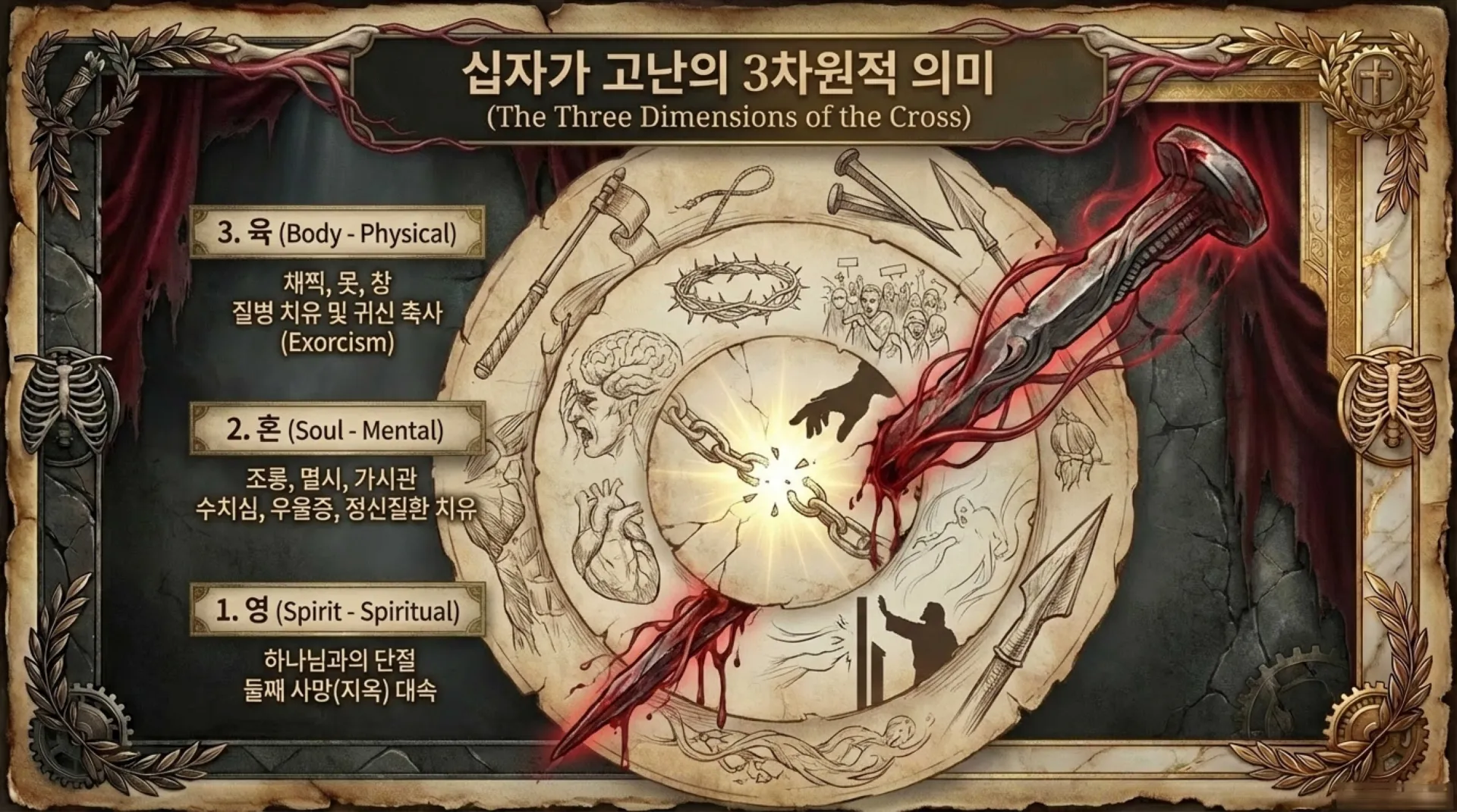우리가 흔히 '예수님의 십자가 고난'을 생각할 때, 단순히 육체적 아픔이나 피 흘리심만을 떠올리는 경향이 있다. 그러나 예수님이 십자가에서 감당하신 고난은 영적(Spiritual), 혼적/정신적(Mental), 육체적(Physical)이라는 세 가지 영역을 모두 포괄하는 전인적인 대속의 사건이다.
