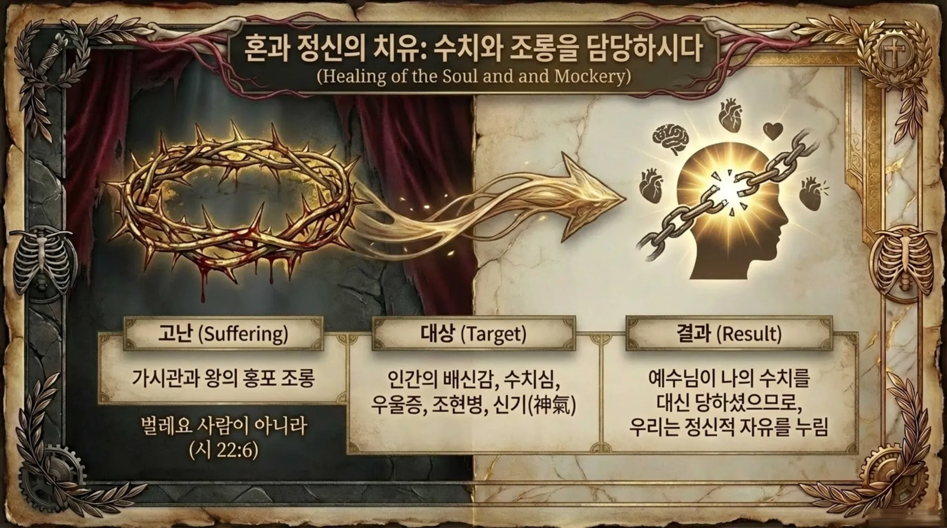 이토록 가혹한 능욕 앞에서도 주님이 입을 열어 그들을 저주하거나 십자가에서 내려오지 않으신 이유는 이사야와 시편의 예언을 온전히 성취하시기 위함이었다. 동시에, 인간이 이 땅에서 겪는 모든 수치와 배신, 우울증, 조현병, 신기(神氣)와 같은 끔찍한 혼적, 정신적 저주를 당신의 몸에 고스란히 담아내어 십자가에서 끝장내기 위함이었다. 예수님이 나의 수치를 대신 당하셨음을 굳게 믿는 자는, 세상이 주는 어떠한 모욕이나 정신적 질환 앞에서도 결코 무너지지 않고 치유와 해방을 누릴 수 있다.