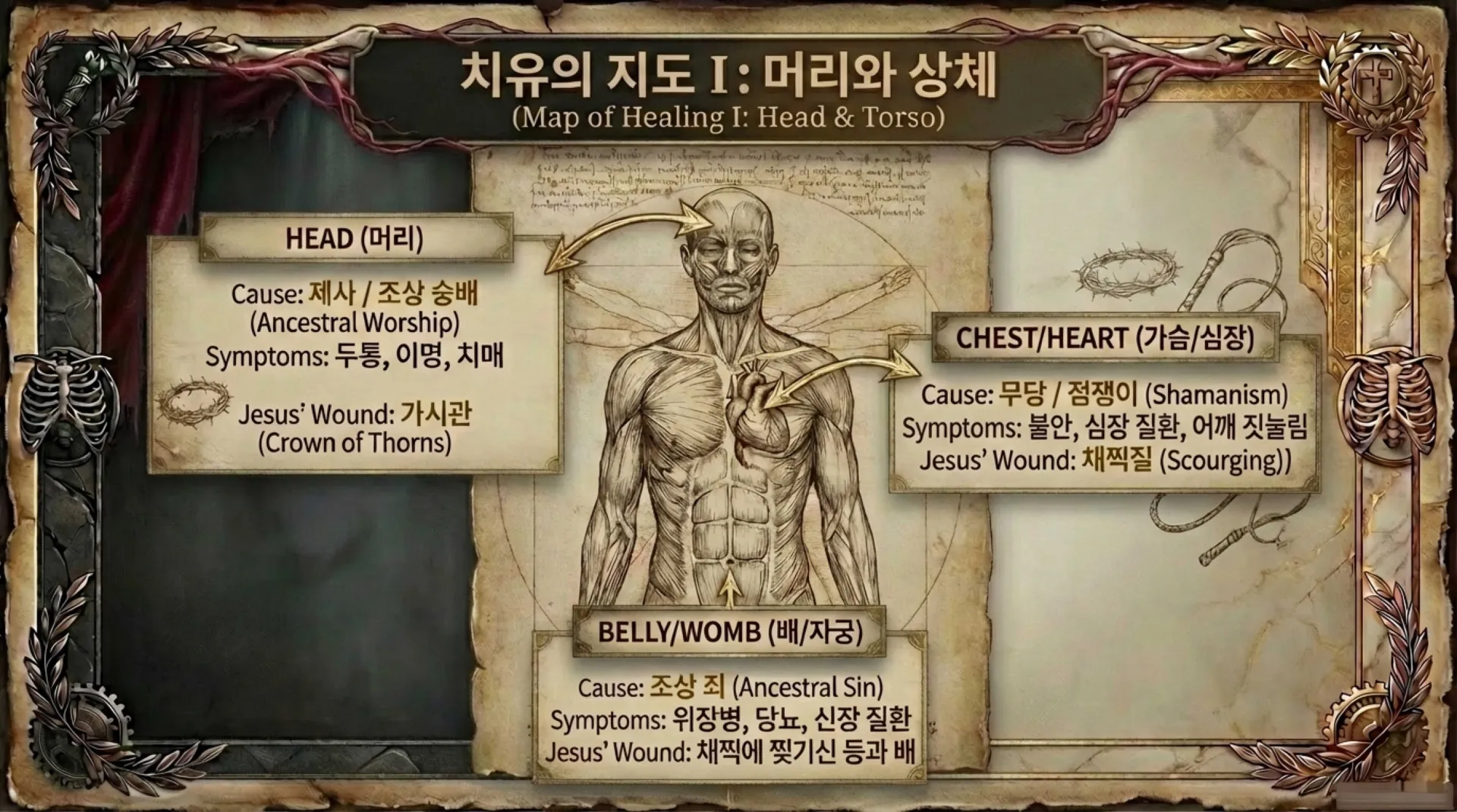 필자는 지난 수년간 영적 전투의 최전선에서 수많은 귀신(뱀들)을 쫓아내며 깨달은 충격적인 진실은, 인간의 죄악(특히 4대 우상 숭배)을 타고 들어온 악한 영들이 인체의 특정 부위에 견고한 진을 친다는 것이다.