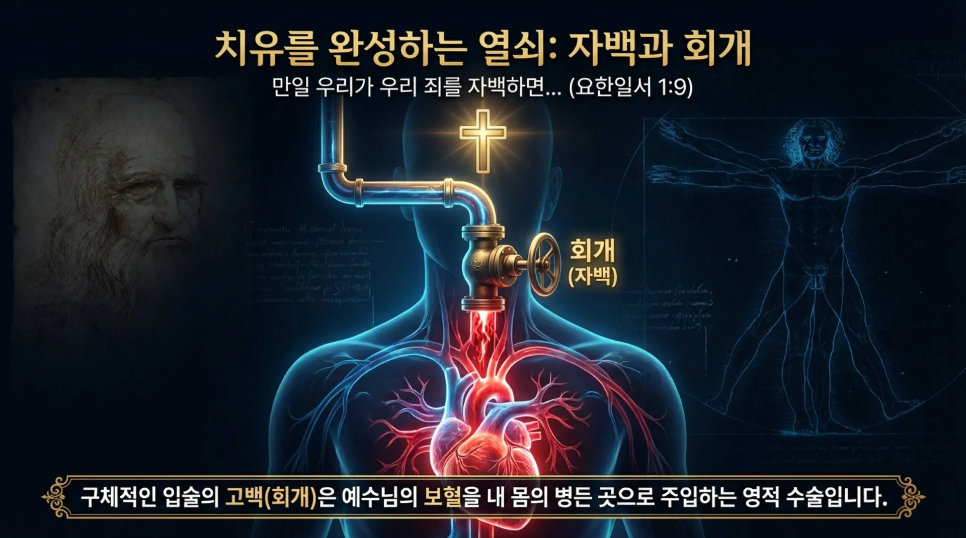 깊이 박혀있는 암 덩어리를 제거하려면 의사의 날카로운 메스로 피부를 찢고 직접 환부를 도려내야 하듯, 수십 년, 수백 년간 가문을 타고 내려와 내 뼈와 근육에 진을 치고 있는 귀신들을 뽑아내려면 피를 토하는 철저한 '회개'가 필요한 것이다. 안수하여 밖에서 불을 머리에 넣는 것만으로는 부족하다. 회개 기도문을 입술로 선포하며 내 육체 속에 예수님의 피를 집어넣을 때, 예수님이 당하신 그 처절한 육체적인 고난이 내 몸에 적용되어 악한 영들이 견디지 못하고 떠나가는 것이다. 그러므로 회개 없는 구원은 관념에 불과하다. 철저히 회개하여 내 몸 구석구석을 장악한 악한 영들을 내쫓을 때에만, 우리는 십자가의 혜택을 온전히 누리는 진짜 이기는 자가 될 수 있는 것이다.